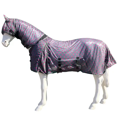 Gallop Cherries & Berries fly mesh combo. This pretty and unique print will not only give excellent coverage from the sun and flies but it will also be a must have for your horses spring wardrobe. Covered in our favourite summery fruits will brighten up and look fabulous on the yard and in the field. Along with the light weight, this set will be a sure must have for this season. 200 denier Ultra-breathable mesh outer Nylon lined neck and chest Fixed neck with loop for headcollar attachment UV Protection Crossed Surcingles