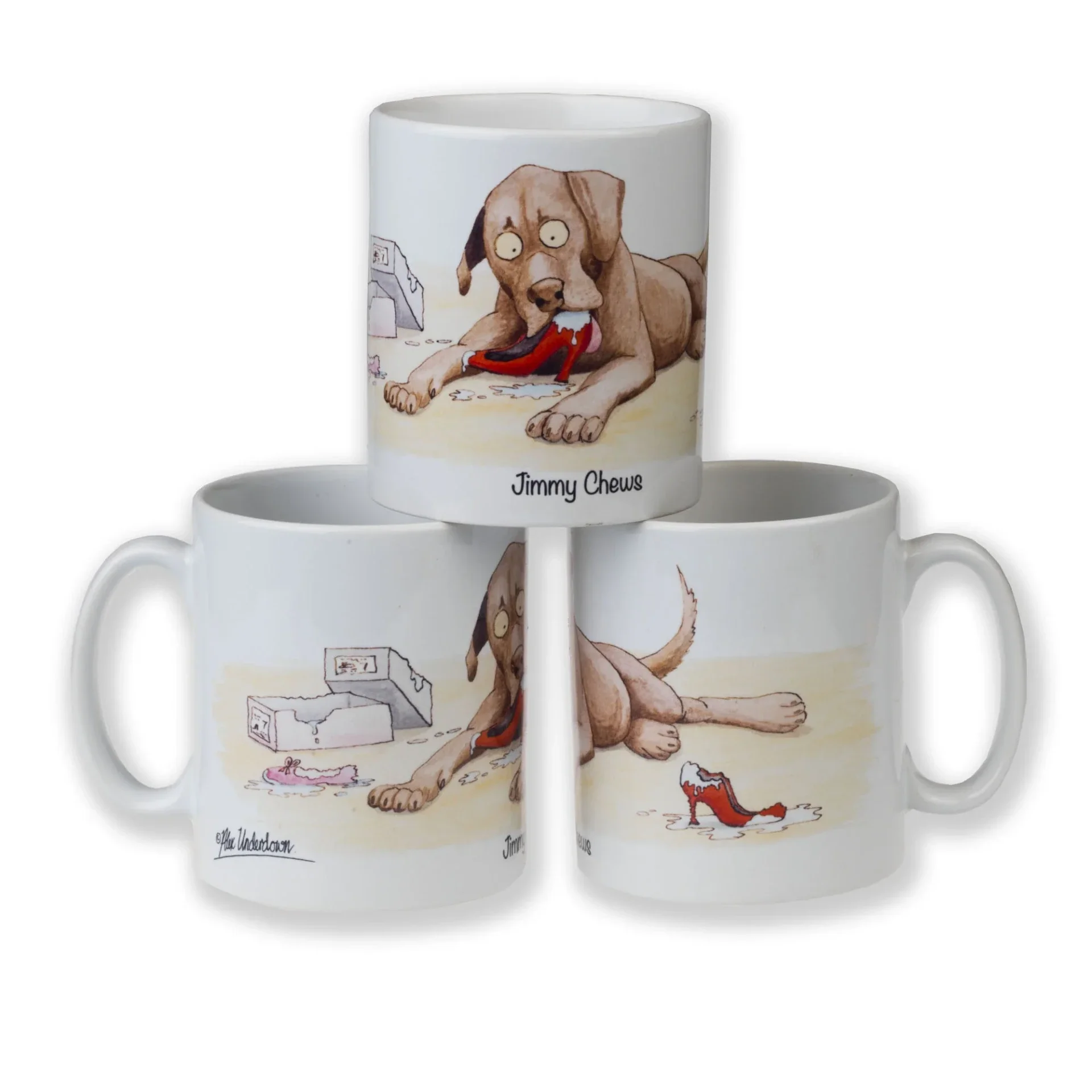 Ceramic mug featuring dog cartoon by Alex Underdown. Jimmy Chews
